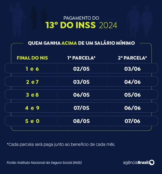 Os aposentados e pensionistas do Instituto Nacional do Seguro Social (INSS) que ganham mais de um salário mínimo começam a receber nesta quinta-feira (2) a antecipação do décimo terceiro. O pagamento vai até o próximo dia 8, com as datas definidas conforme o dígito final do Número de Inscrição Social (NIS).