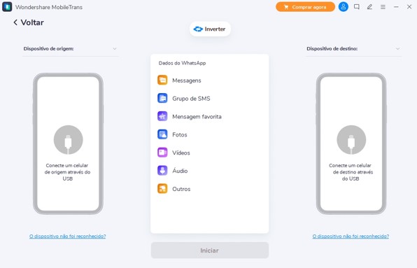 Certifique-se de que os dispositivos estão na posição correta para a transferência: o celular de origem (com as conversas) deve estar à esquerda na tela, enquanto o celular de destino (que receberá as conversas) deve estar à direita. Se eles estiverem invertidos, basta clicar no botão "Inverter" no centro superior da tela para corrigir a posição.