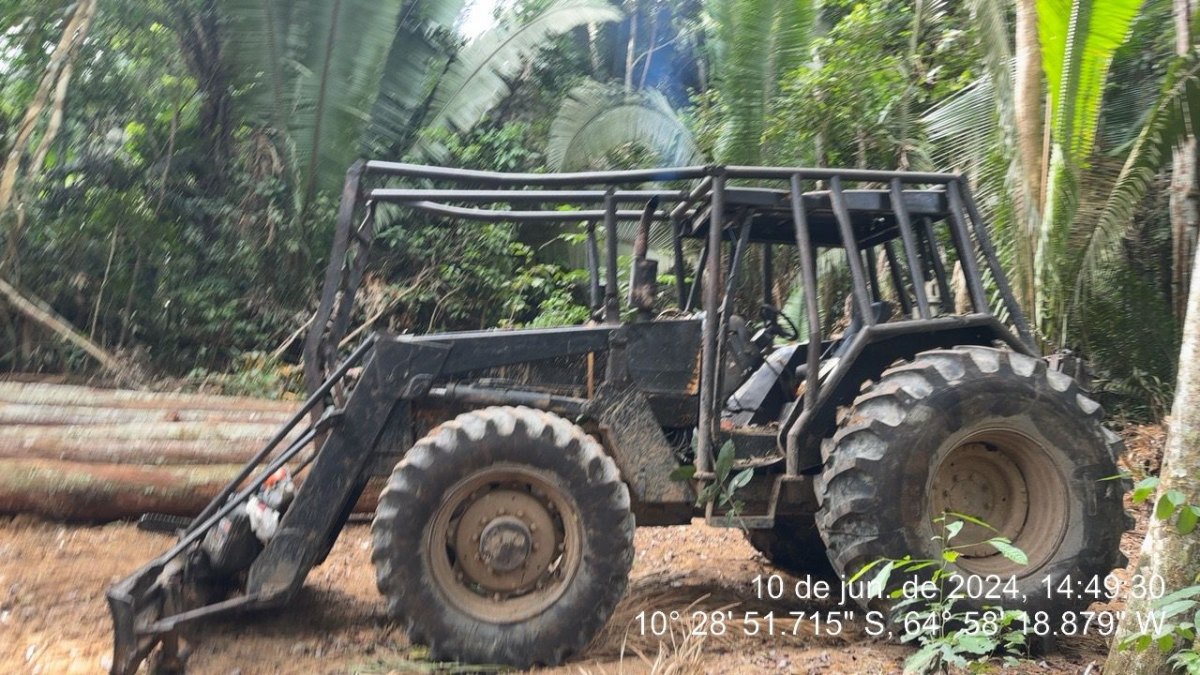 Durante o patrulhamento na Terra Indígena, foi apreendido 01 (um) trator, com guincho para a retirada de madeira, utilizado na extração ilegal.
