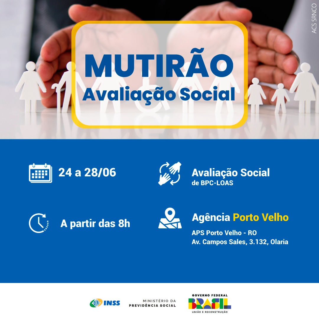 São 1.250 vagas para avaliações sociais, que serão realizadas entre 24 e 28 de junho, a partir das 8h da manhã, na Agência da Previdência Social Porto Velho, localizada na Avenida Campos Sales, 3.132, Olaria, Porto Velho (RO).