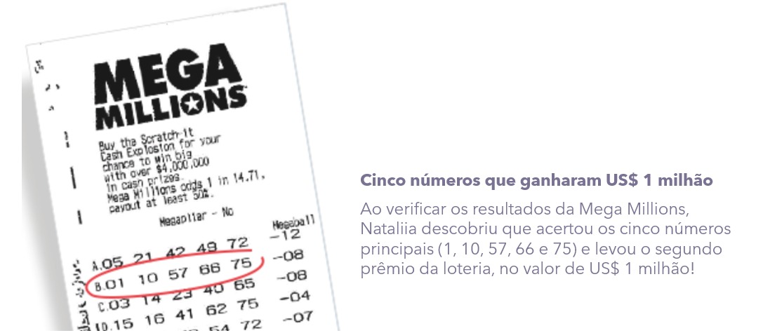 Nossos clientes não somente jogam nas loterias, eles também ganham! Há pouco tempo atrás, uma jogadora ucraniana chamada Nataliia ganhou um prêmio de US$ 1 milhão jogando na loteria Mega Millions usando o serviço. Em seus 22 anos de história, a TheLotter construiu uma reputação que fala por si, com mais US$ 125 milhões de dólares pagos para mais de 9 milhões de bilhetes ganhadores do mundo todo.