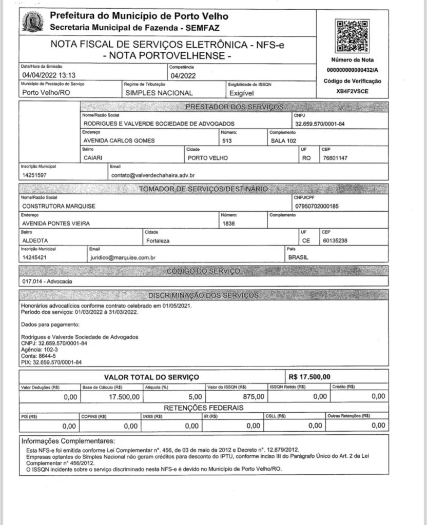 Documentos recebidos comprovam advogado Bruno Valverde, que advoga para o prefeito, Hildon Chaves, também prestou serviços para a empresa envolvida no contrato, a Marquise.