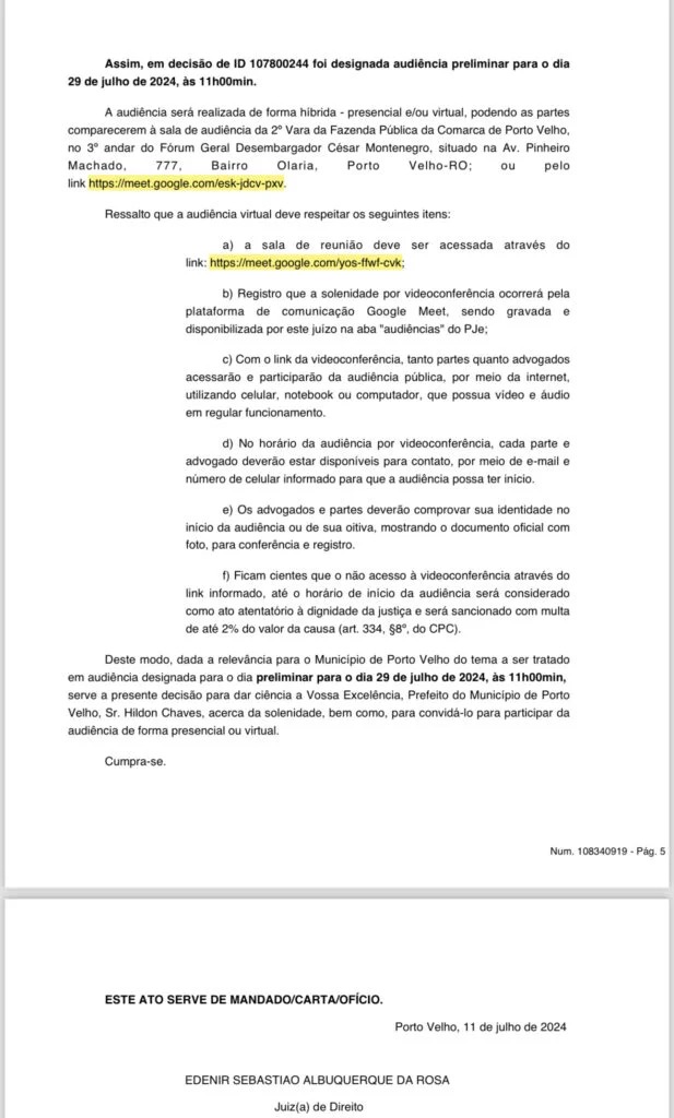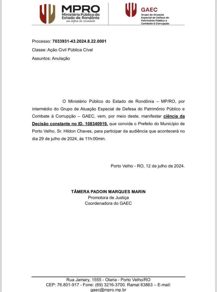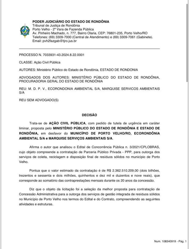 Em meio às controvérsias envolvendo o contrato de mais de R$ 2 bilhões entre a Prefeitura de Porto Velho e a empresa Eco Rondônia, subsidiária da Construtora Marquise, uma nova audiência foi marcada para o próximo dia 29 de julho de 2024, às 11h, no Fórum Geral de Porto Velho. O Ministério Público do Estado de Rondônia (MP-RO), por meio do Grupo de Atuação Especial de Defesa do Patrimônio Público e Combate à Corrupção (GAEC), e a Procuradoria do Estado de Rondônia (PGE-TC), através da setorial que atua junto ao Tribunal de Contas do Estado de Rondônia, são os autores da ação civil pública ajuizada em face do município de Porto Velho, do qual requerem que o Prefeito de Porto Velho obedeça a ordem da Corte de Contas, que inclusive já transitou em julgado.