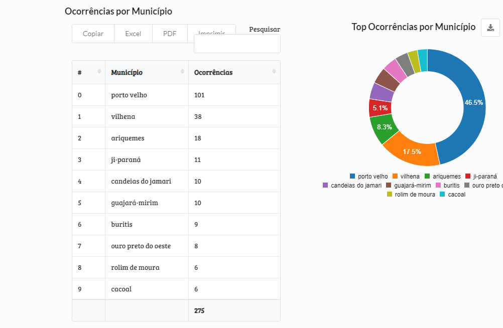 Outro dado fornecido pelo levantamento, é de que nesta lista macabra a liderança nos homicídios ficou com Porto Velho, onde foram mortas, no período em análise, 101 pessoas. Em segundo lugar aparece Vilhena, com 38 mortos. Na terceira posição está Ariquemes com 28 assassinatos, seguida por Ji-Paraná.