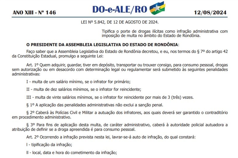A Assembleia Legislativa de Rondônia – ALE/RO, promulgou no Diário Oficial desta última segunda-feira (12) a Lei 5.842, de 12 de agosto de 2024, que tipifica o porte de drogas ilícitas como infração administrativa com imposição de multa no âmbito do Estado de Rondônia.