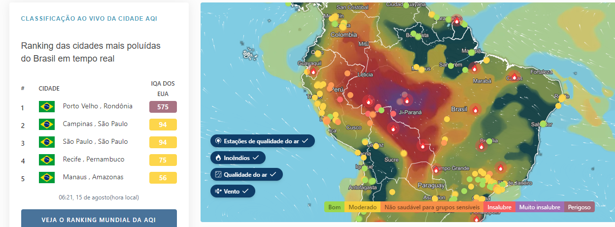 Porto Velho voltou a liderar o ranking mundial de poluição nesta quinta-feira, segundo dados da plataforma IQAir, que monitora a qualidade do ar em tempo real. O índice de poluição na capital alcançou o nível alarmante de 575, classificado como "perigoso" para a saúde humana. Especialistas alertam que esse nível de poluição representa um risco significativo para a população, especialmente para grupos vulneráveis, como crianças, idosos e pessoas com problemas respiratórios.