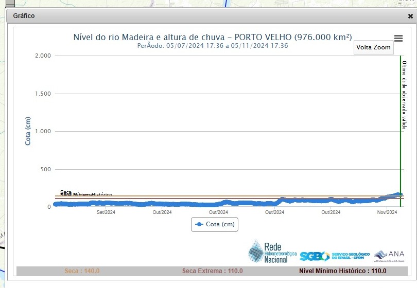 Apesar do parâmetro histórico observado muito recentemente no rio, o nível da água voltou a subir. Segundo dados do Serviço Geológico Brasileiro (SGB), de 23 de outubro - quando o Madeira registrou uma cota mínima histórica de 30 cm e a movimentação de cargas foi interrompida -, até o presente dia da publicação deste texto o nível da água subiu 126 cm.