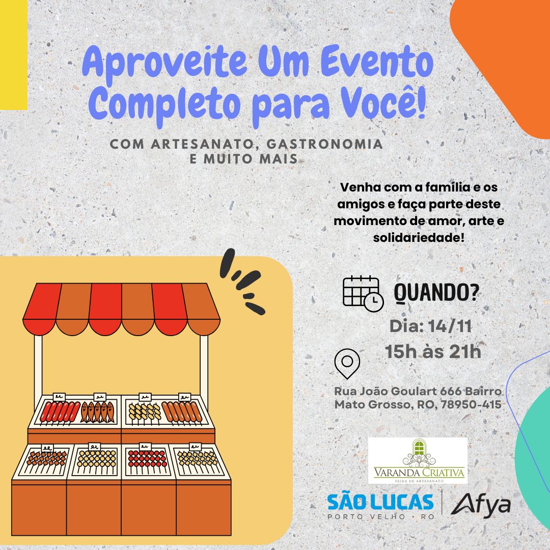 A Varanda Criativa estará no local com exposição de artes, gastronomia e artesanato. A feira é aberta a toda comunidade e serão dadas palestras sobre cuidados com animais. Os organizadores informam que estará sendo feito o cadastro de quem estiver interessado na adoção responsável de animais (gatos e cachorros). Mais informações podem ser obtidas pelo telefone 69 9 8491 0952, falar com Daniel Reis.