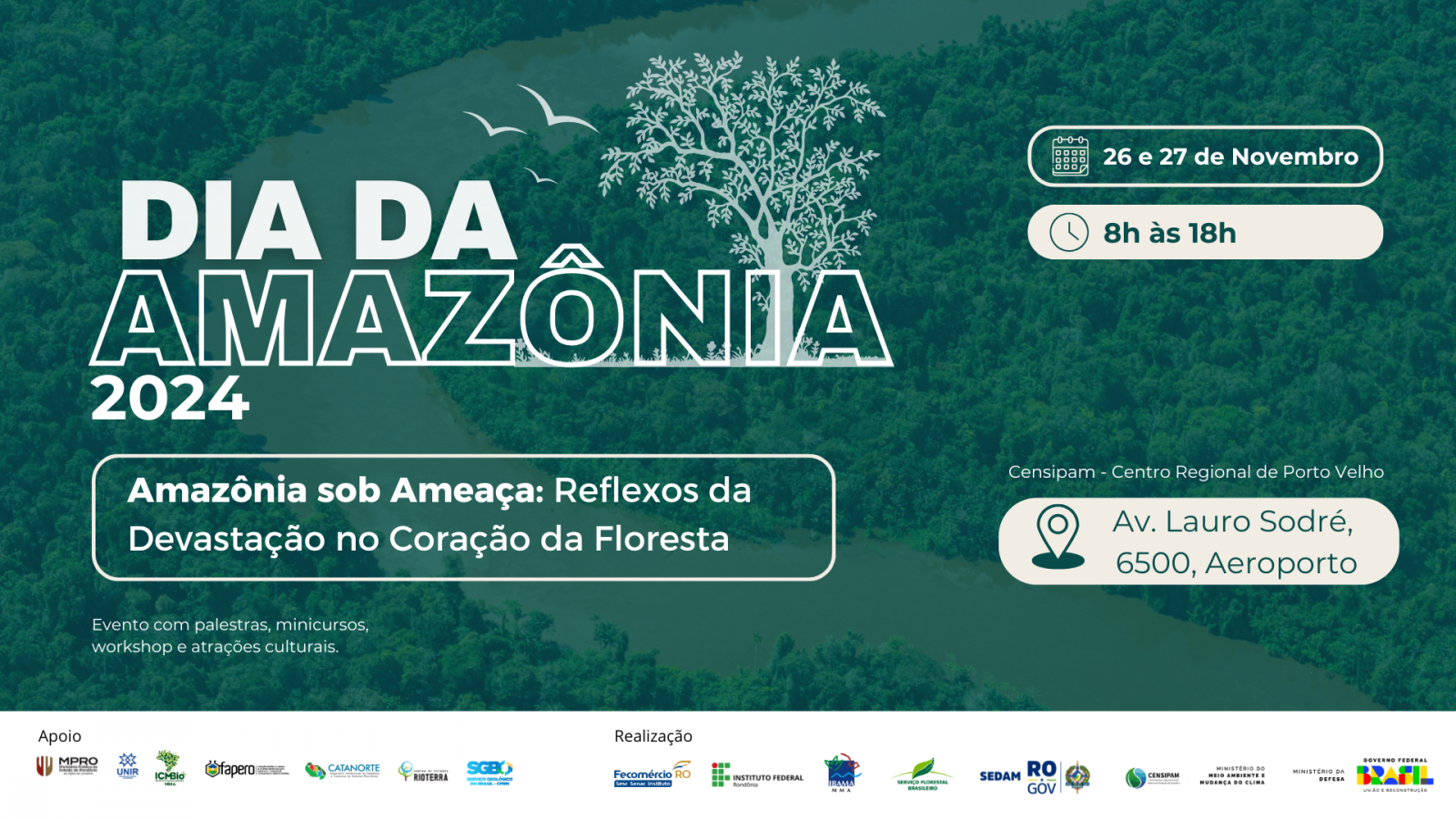 Nos dias 26 e 27 de novembro, acontecerá no Centro Regional de Porto Velho - Censipam, o evento ‘Dia da Amazônia’. Haverá palestras, workshops, minicursos, ministrados por órgãos ambientais parceiros e atrações culturais durante os dois dias. Quem participar tem direito a certificação mediante inscrição e presença. As inscrições podem ser feitas no endereço eletrônico: