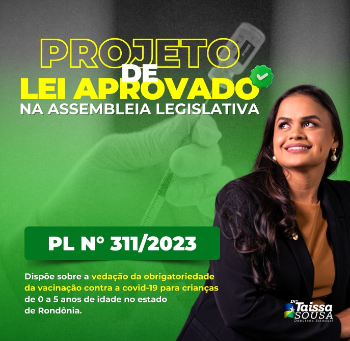 E a deputada estadual Dra. Taíssa celebrou a aprovação pela Assembleia Legislativa de Rondônia do Projeto de 311/2023, que desobriga os pais a vacinarem os filhos menores, de 0 a 5 anos, contra covid-19. Um verdadeiro retrocesso, coisa da idade média. O pior é que por ideias como essas, vacinas estão se estragando e uma doença que poderia ser controlada, pode voltar a atormentar a vida da população. Isso porque, gente como a deputada pode estimular a mutação do vírus da covid-19, criando cepas mais resistentes e aí, só Deus sabe o que pode ocorrer.