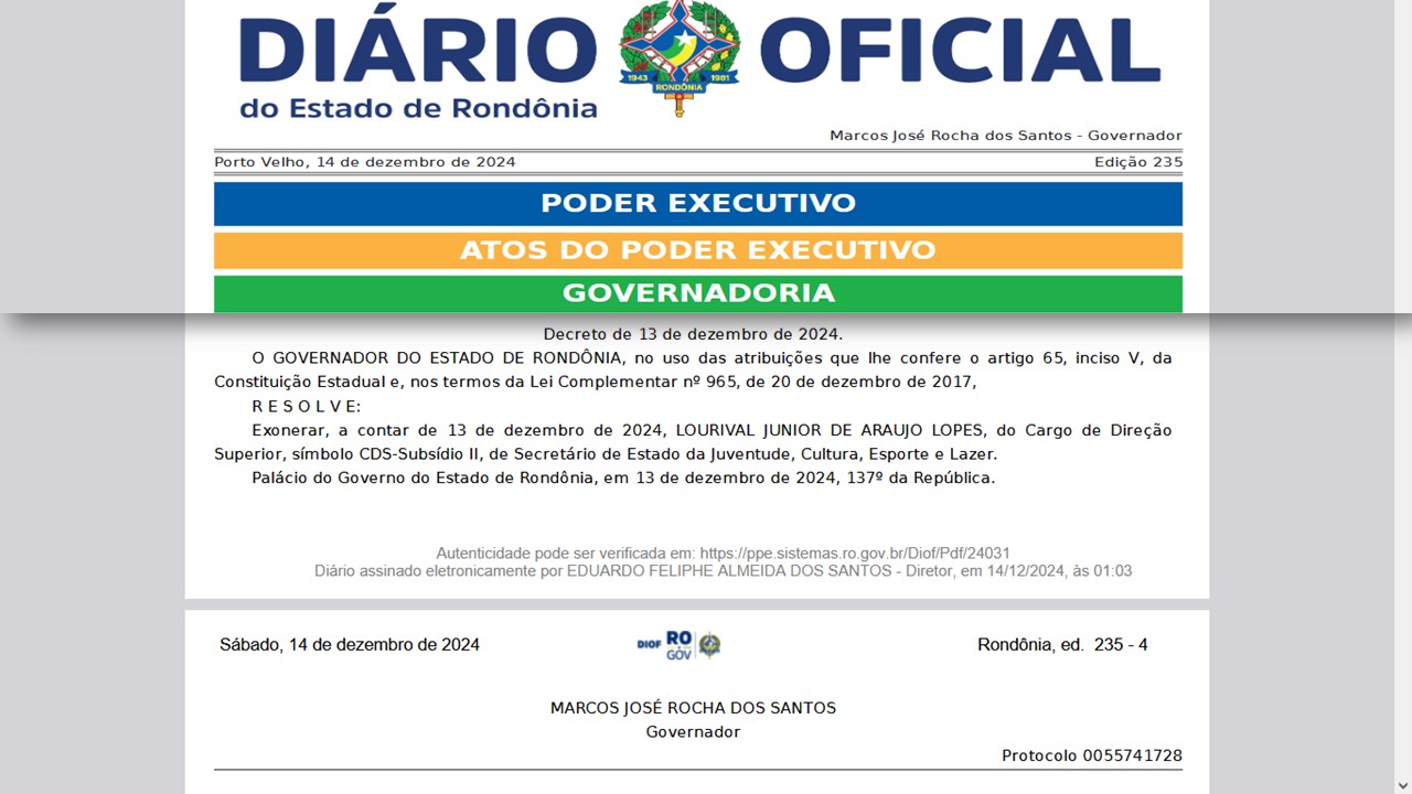 O secretário da Secretaria Estadual da Juventude, Cultura, Esporte e Lazer (Sejucel), Lourival Junior de Araújo Lopes foi exonerado do cargo, após ser preso na segunda etapa da Operação Dionísio – desencadeada na sexta-feira (13) pelo Ministério Público de Rondônia para investigar malversação de recursos públicos em grandes eventos realizados em Rondônia.