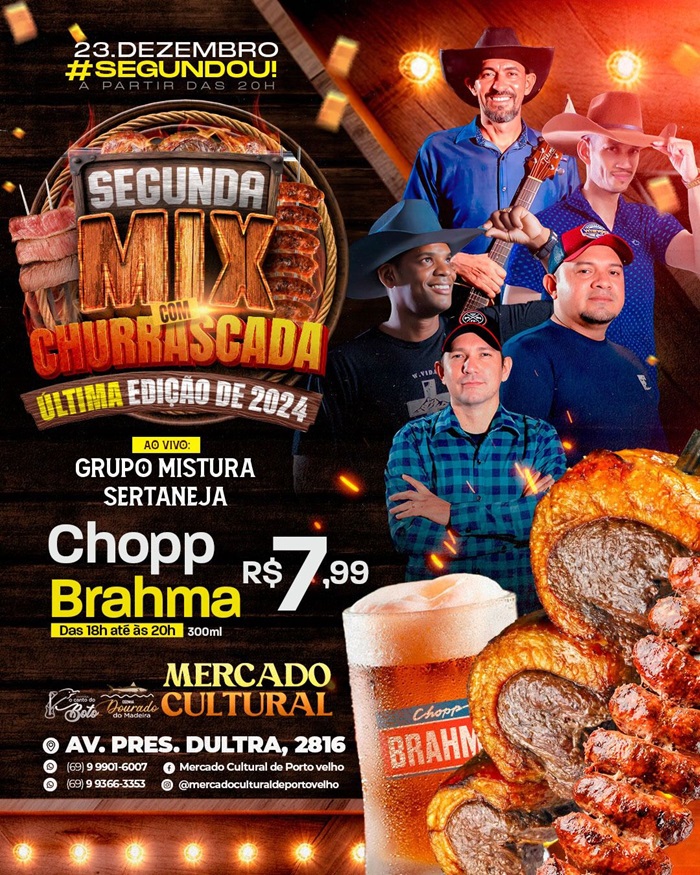 “Chegamos na última edição de 2024, da nossa tradicional ‘Segunda Mix Com Churrascada’, considerada a melhor noite de segunda-feira da capital rondoniense, que acontece há anos no Mercado Cultural de Pv”, disse o empresário Sinezio Tapajos, permissionário do box Dourado do Madeira, acrescentar que o evento musical e gastronômico, começa a partir das 18h, com promoção de chopp Brahma, e o show do grupo Mistura Sertaneja, começa a partir das 20h.