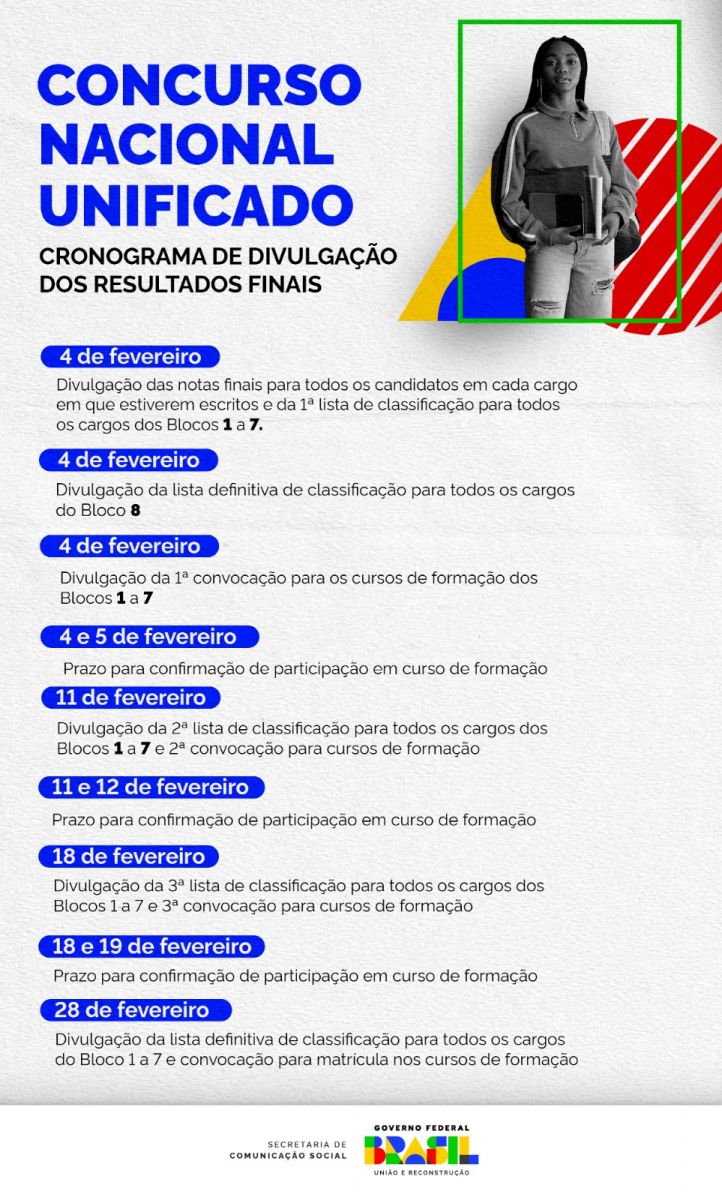 A divulgação da nota final para todos os candidatos do Concurso Público Nacional Unificado (CPNU) será em 4 de fevereiro. O anúncio foi feito pelo Ministério da Gestão e da Inovação em Serviços Públicos (MGI) nesta terça-feira, 14 de janeiro, durante coletiva de imprensa. A antecipação dos resultados contempla todos os candidatos dos Blocos 1 a 8.