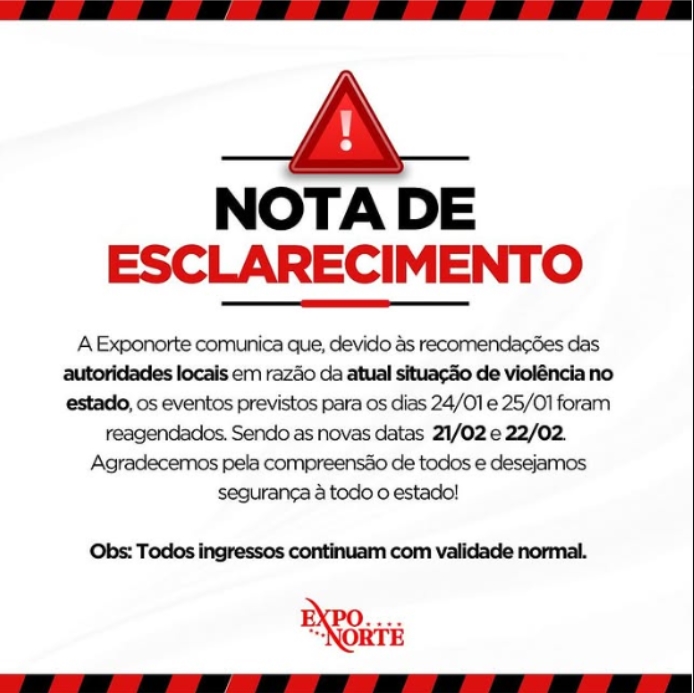 A dupla Maiara e Maraísa anunciou, nesta quarta-feira (22) pela página da Exponorte o adiamento dos seus shows nas cidades de Vilhena, Ji-Paraná e Cacoal, em Rondônia, devido à onda de violência no estado.