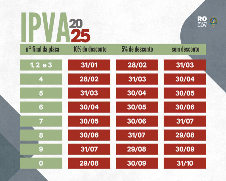 O calendário de pagamento do Imposto sobre a Propriedade de Veículos Automotores (IPVA) para 2025 define o prazo para pagamento com 10% até esta sexta-feira (31), mas o contribuinte terá ainda, a opção de aproveitar o desconto de 5% até o dia 28 de fevereiro. De acordo com a Sefin, o cronograma segue o padrão de organização baseado no último dígito da placa dos veículos, com o primeiro vencimento sem descontos em março.
