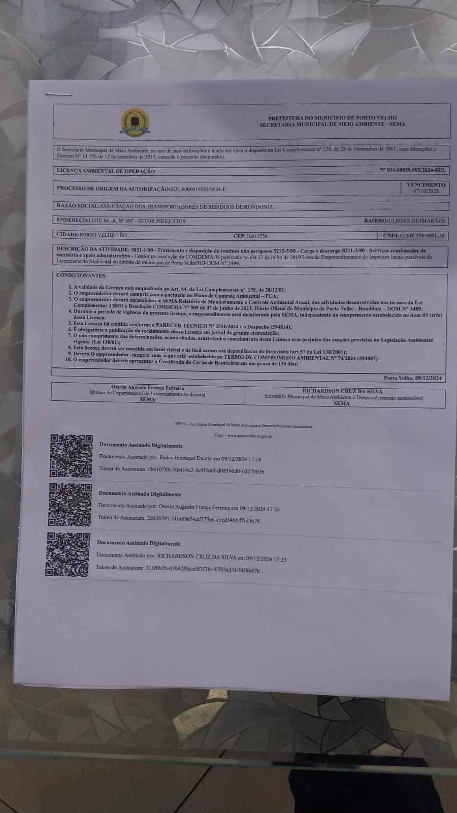 A licença ambiental emitida pela Sema e autoriza o funcionamento do centro de tratamento da associação dos "papa entulho" de Porto Velho tem vigência até o ano de 2028.