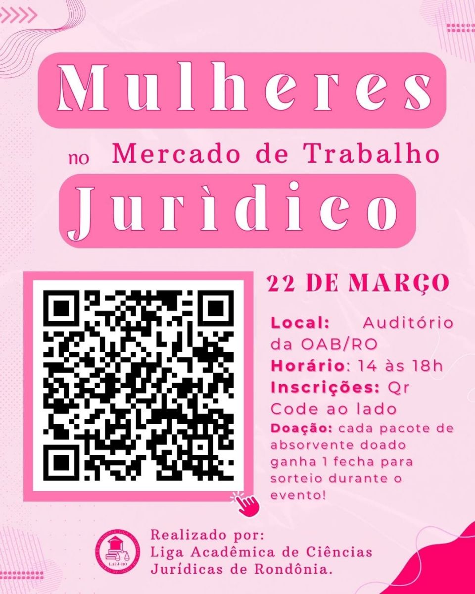 A Liga Acadêmica de Ciências Jurídicas de Rondônia (LACJRO) promove no dia 22 de março, no Auditório da OAB-RO, o evento “Mulheres no Mercado de Trabalho Jurídico”, que trará um debate essencial sobre inclusão, equidade e inovação no setor. O encontro ocorre das 14h às 18h, e as inscrições podem ser feitas pelo site Even3 até o dia 21 de março.