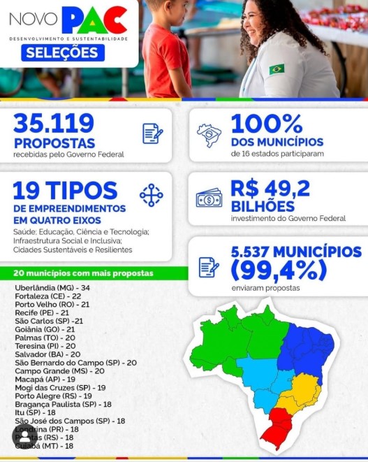Foram recebidas 35.1 19 propostas para a segunda edição do Novo PAC Seleções 2025, enviadas por 5.537 municípios - um total que corresponde a 99,4% das cidades do país.