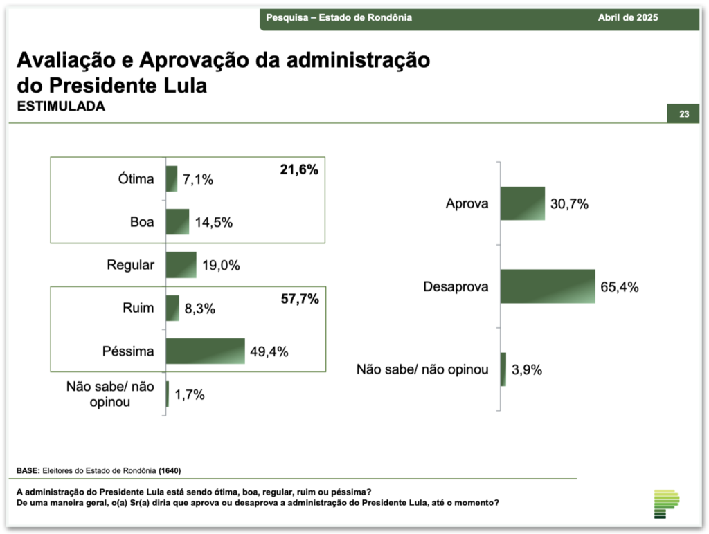 Levantamento divulgado nesta 5ª feira (17.abr.2025) pelo Paraná Pesquisas mostra que a desaprovação do governo do presidente Luiz Inácio Lula da Silva (PT) chega a 65,4% em Rondônia (RO). Outros 30,7% disseram aprovar a gestão do petista, enquanto 3,9% não responderam. Eis a íntegra (PDF – 574 kB). O estudo foi realizado de 9 a 13 de abril, com 1.640 entrevistados em 35 municípios do Estado. A margem de erro é de 2,5 pontos percentuais e o nível de confiança é de 95%.