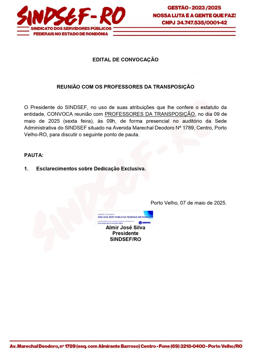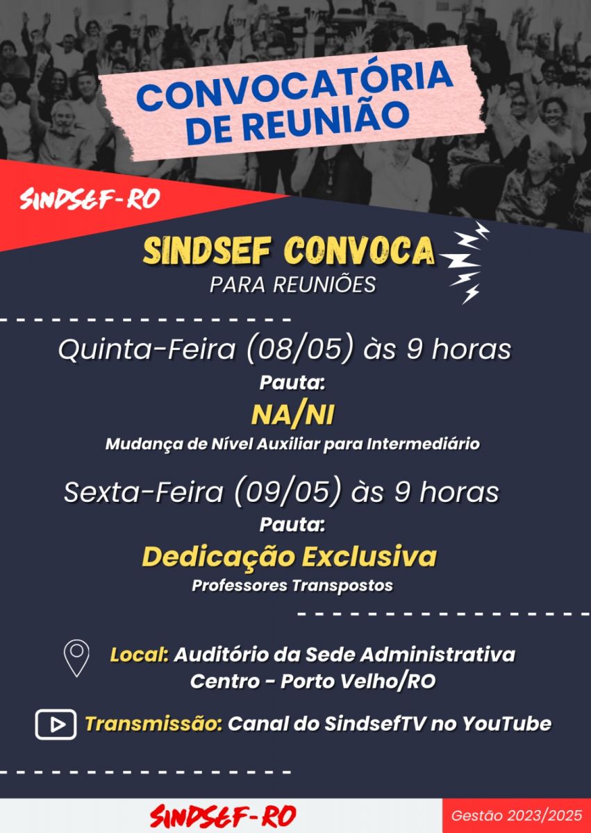 E na sexta-feira, dia 9 de maio, também às 9h, o Sindsef convoca os professores para reunião exclusivamente para tratar da pauta sobre Dedicação Exclusiva.