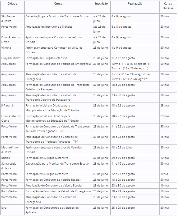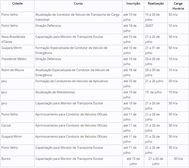 Com o intuito de formar, capacitar e atualizar conhecimentos, o Departamento Estadual de Trânsito (Detran-RO) divulga o calendário de cursos para diversos municípios, com inscrições que se encerram em julho. As capacitações, organizadas pela Escola Pública de Trânsito (Eptran) são nas áreas de transporte coletivo de passageiros, veículos de emergência, transporte escolar, direção defensiva e mototaxistas.