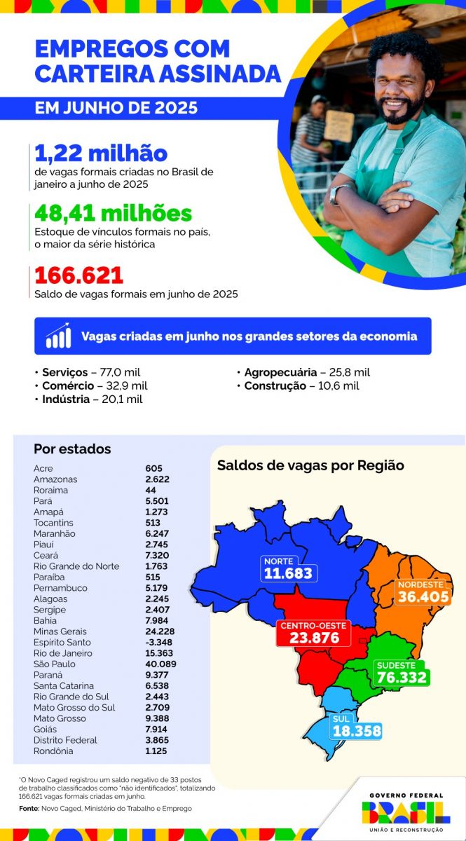 NACIONAL – O Brasil superou a marca de 1,2 milhão de empregos com carteira assinada criados nos seis primeiros meses de 2025. São 1.222.591 vagas e saldo positivo nos cinco setores da economia avaliados. Só no mês de junho, foram 166.621 postos de trabalho formais. O estoque, que representa o total de vínculos empregatícios formais ativos no país, superou o patamar de 48,4 milhões.