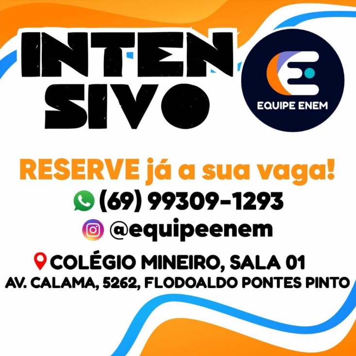 Estudantes interessados em participar de um Curso Pré Vestibular Intensivo Equipe Enem já podem se inscrever pelo fone 69 99309 1293, ir na sede do Colégio Mineiro, localizado na Av. Calama (sala 01) e também seguir a página do instagran @equipeenem. Os primeiros 30 alunos ganham bônus especial de 10% na inscrição. O curso terá início na próxima quarta-feira (10) e seguirá até o dia 14 de novembro.