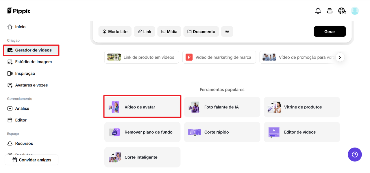 Após fazer login, vá em Gerador de Vídeos no menu lateral. Em seguida, escolha Ferramentas Populares, depois Vídeo de Avatar para encontrar ou criar um personagem para o seu vídeo.