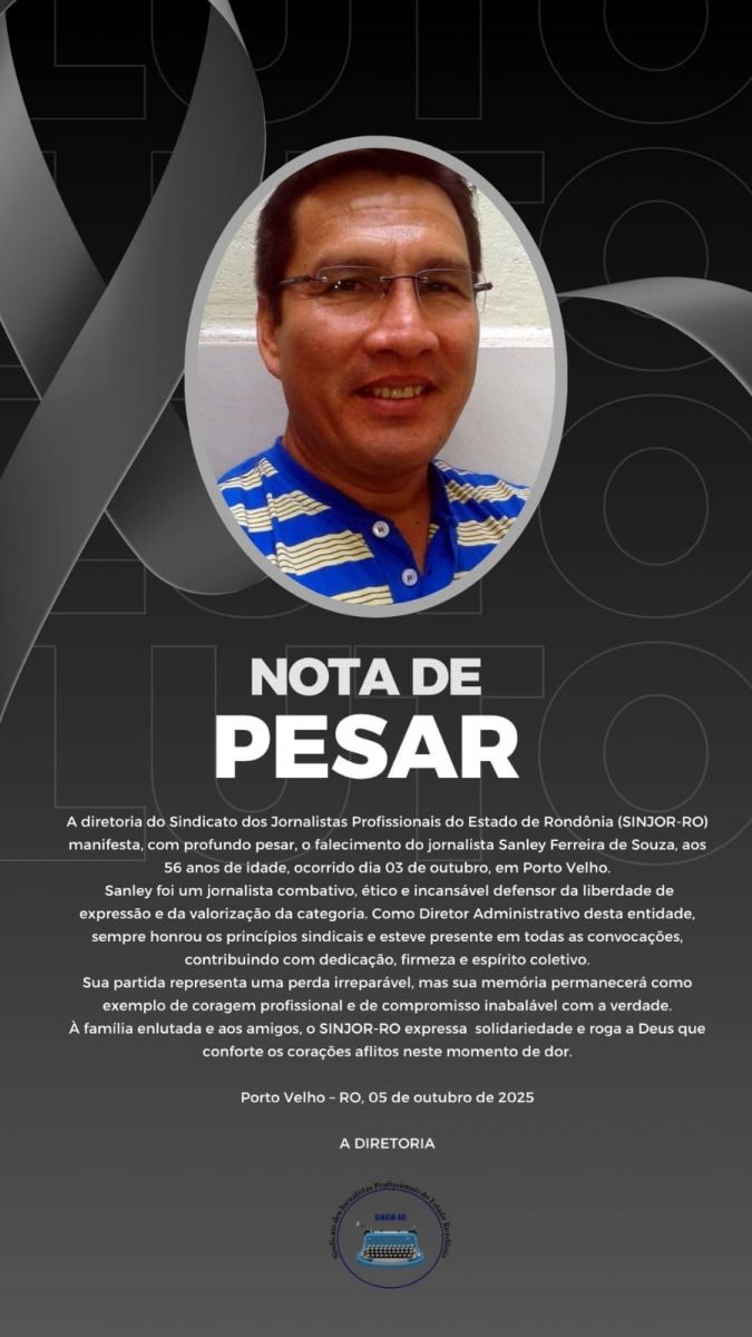 O Sindicato dos Jornalista Profissionais de Rondônia (Sinjor-RO) emitiu nota de pesar pelo falecimento do combativo jornalista Sanley Ferreira de Souza, ocorrido em Porto Velho. O profissional teve condunta exemplar e foi diretor adminisrativo no Sinjor.