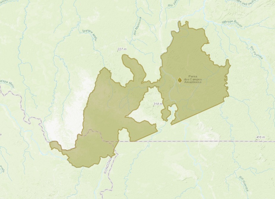 MAPA: Captura de tela, reprodução via Unidades de Conservação no Brasil - PARNA Campos Amazônicos é ameaçado por pressões do crime
