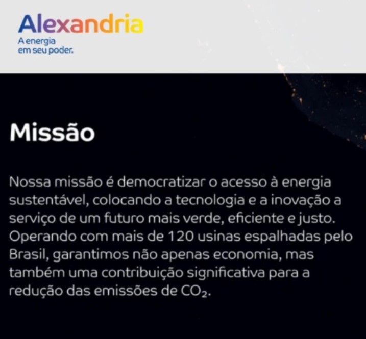 A principal proposta da Alexandria é fornecer energia proveniente de fontes 100% renováveis (solar e eólica) por meio de um modelo de assinatura, onde o cliente não precisa instalar placas solares em casa ou fazer investimentos.