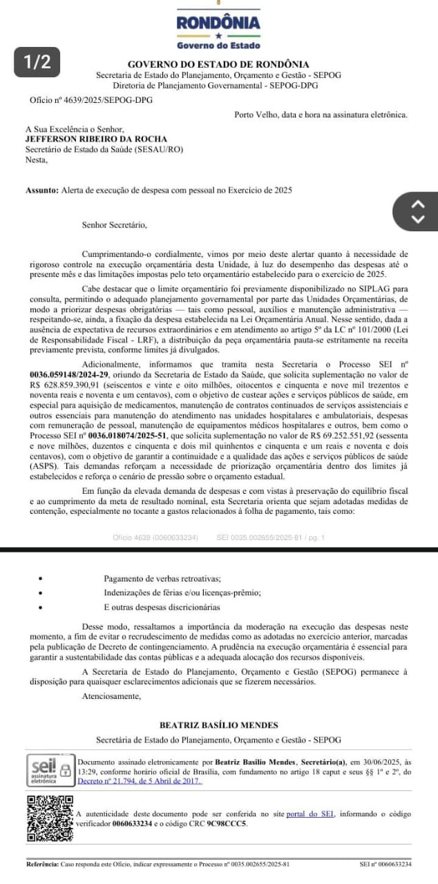 Rondoniaovivo teve acesso, revela alerta emitido pela Secretaria de Estado de Planejamento, Orçamento e Gestão (Sepog) orientando a Secretaria de Estado de Saúde (Sesau) a segurar gastos não obrigatórios para não arrombar o orçamento e evitar medidas drásticas como bloqueio de verbas.
