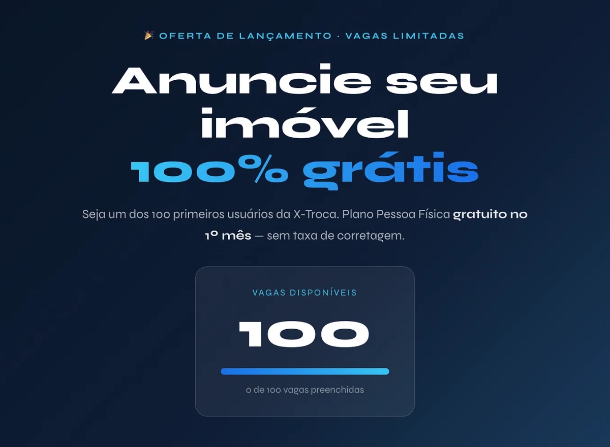Para marcar o lançamento, a X-Troca disponibilizou uma oferta limitada a 100 usuários: o primeiro mês do plano Pessoa Física completamente gratuito, via cupom de desconto XTROCA100, com 100% de desconto aplicado automaticamente no checkout.