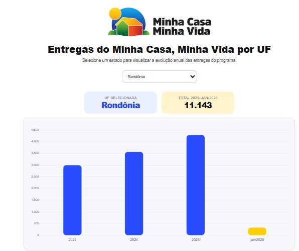 As informações do Ministério das Cidades indicam que, no recorte anual no estado de Rondônia, são 3 mil unidades concluídas em 2023, 3,5 mil em 2024 e 4,2 mil em 2025, além de 322 já finalizadas e entregues no início de 2026. Em todo o país, são 1,4 milhão de unidades finalizadas e entregues pelo programa habitacional desde 2023.