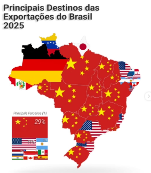A China foi, novamente, o maior parceiro comercial do Brasil, com mais de US$ 100 bilhões em compras de produtos brasileiros. Na segunda posição aparecem os Estados Unidos, que importaram cerca de US$ 38 bilhões, mesmo com uma queda de 6,6% nas compras ao longo do ano, influenciada por tarifas comerciais aplicadas durante o período.