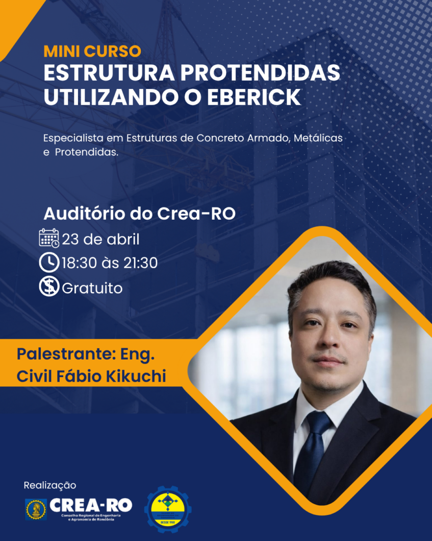 O Crea-RO, em parceria com o Clube de Engenharia, promovem, no dia 23 de abril, o mini-curso “Estruturas Protendidas utilizando o Eberick”, uma oportunidade de capacitação voltada a engenheiros, profissionais da área tecnológica e estudantes que desejam aprofundar conhecimentos em soluções estruturais modernas e de alto desempenho.