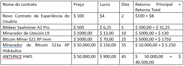 Selecione um contrato de mineração e ative seu poder de mineração. Escolha um contrato que melhor se adapte ao seu orçamento e prazo desejado; o sistema liquidará automaticamente seus ganhos diariamente.