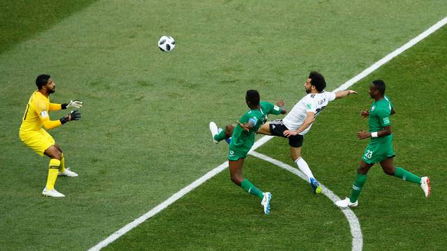 Mais movimentada que a segunda parte do jogo, a etapa inicial teve dois gols e dois pênaltis. O primeiro deles foi de Salah, que deu um toque sutil para encobrir o goleiro saudita e marcar um belo gol.