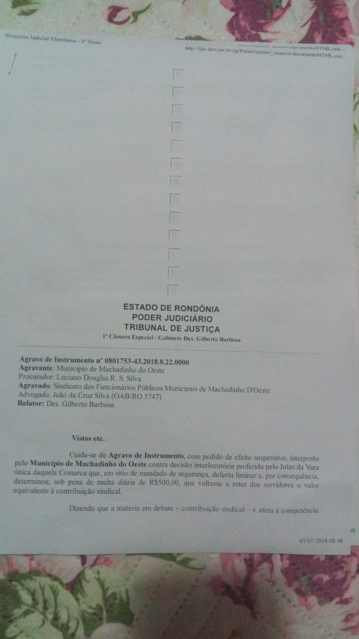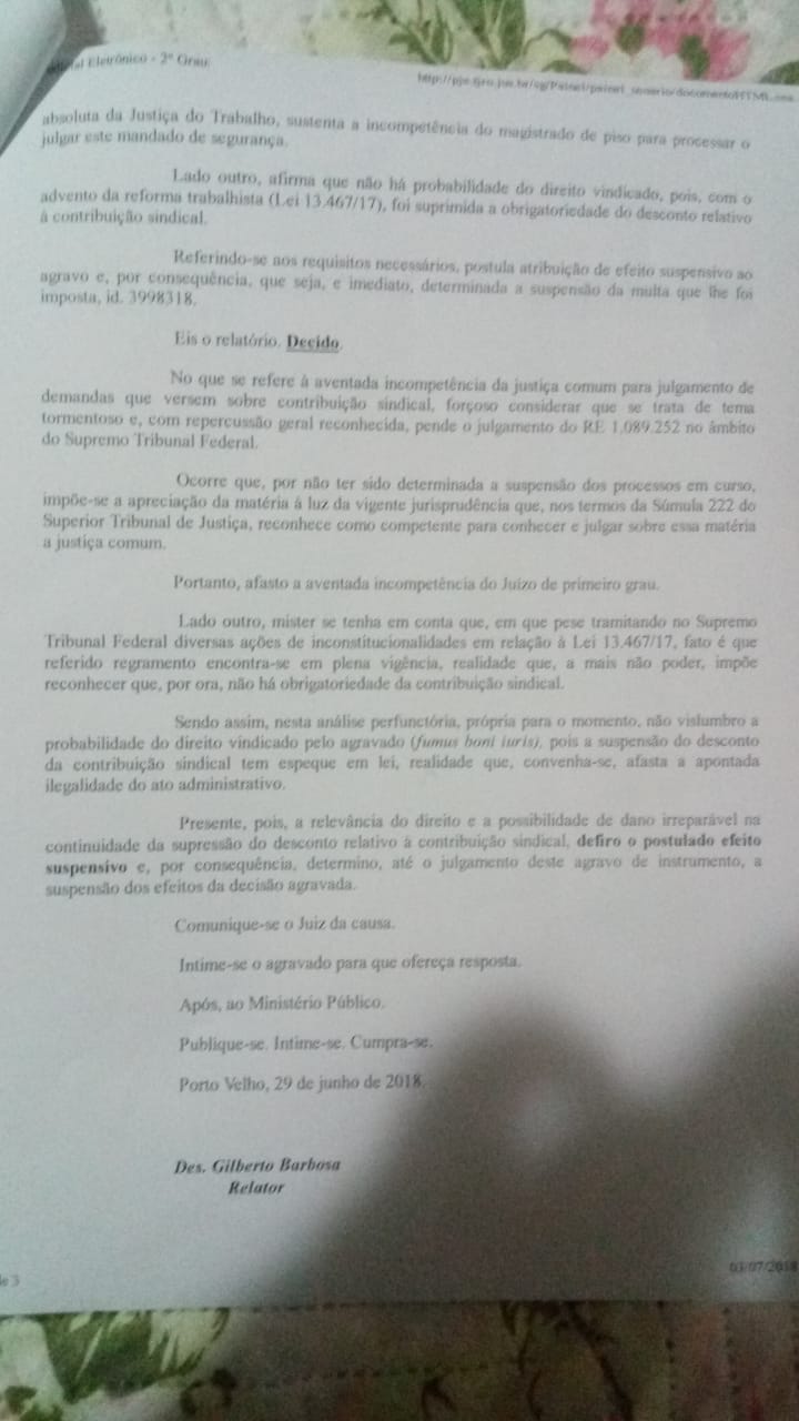 O Desembargador Gilberto Barbosa, em sua decisão disse que a justiça do trabalho sustenta a incompetência do magistrado de (Primeiro Gral) para processar, julgar o tal mandado de segurança. O documento anexo a esta matéria diz que “não há probabilidade do direito vindicado, pois, com o advento da reforma trabalhista de Lei (13.467/17) foi suprimida a obrigatoriedade do desconto relativo à contribuição sindical”. O Juizado determinou então a imediata suspenção das multas impostas a prefeitura municipal de Machadinho d’Oeste.
