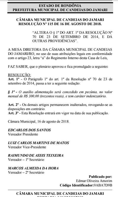Segundo a publicação, a lei foi aprovada e já entrou em vigor na mesma data, onde cita que a forma de pagamento será em dinheiro. Além disso, os demais artigos permanecem inalterados. Anteriormente o valor do auxílio alimentação para os servidores da Casa de Leis era de R$ 120,00 e era segundo infromações levantadas junto a DIreção Legislativa da Câmara Municipal, era o menor do estado. Mesmo com o reajuste o valor figura na l'anterna' dos demais municípios de Rondônia.