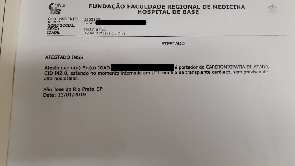 A rotina de passar todos os dias no Hospital da Criança e Maternidade (HCM) em São José do Rio Preto foi diagnosticado no pequeno João, o filho mais novo, Cardiomiopatia Dilatada, que exige um transplante de coração, conforme documentos abaixo.