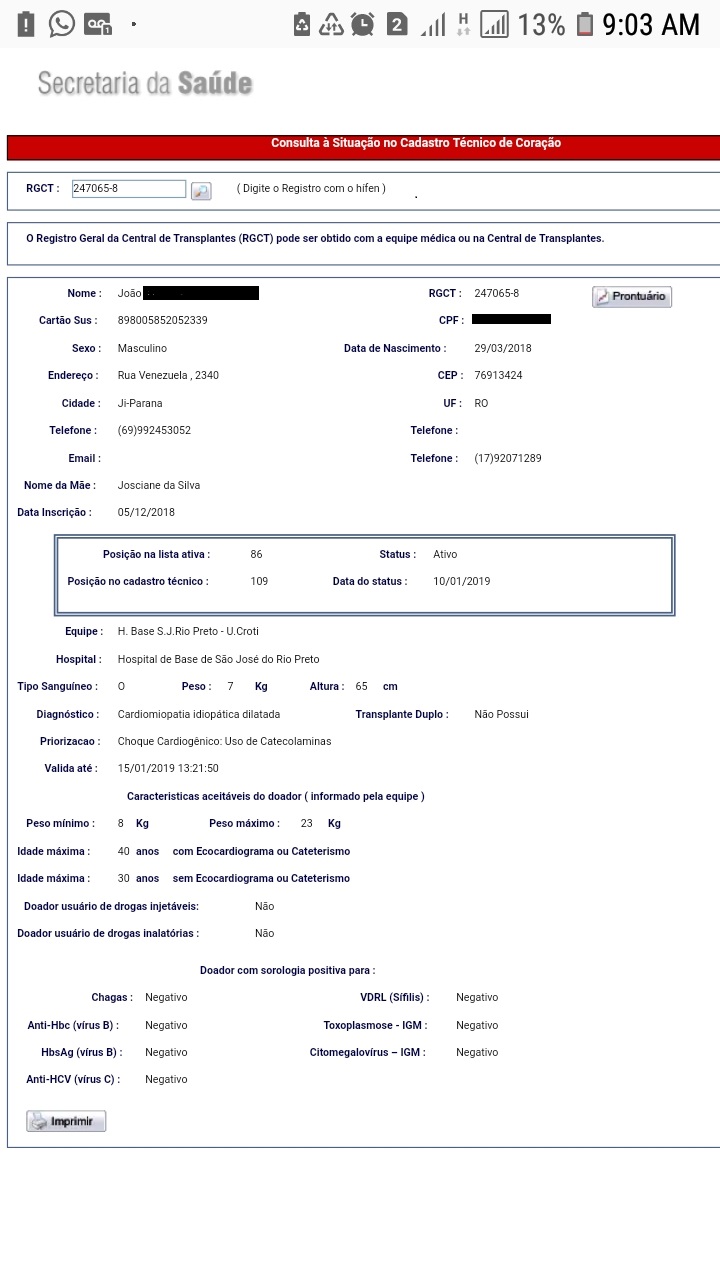 Eu sou de Ji-Paraná Rondônia. E hoje eu me encontro aqui em São José do Rio Preto com meu filho internado na UTI, na qual ele está esperando transplante de coração e hoje vamos por meio das redes sociais pedir ajuda.