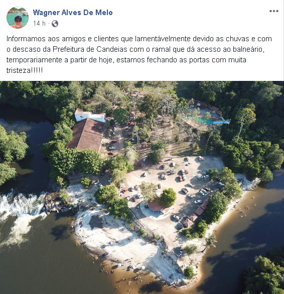 Um dos pontos turísticos mais adorados de Rondônia, com paisagens naturais de se admirar está de portas fechadas por falta de acesso causada pela chuva e "o descaso da Prefeitura de Candeias", segundo anunciou o proprietário do local em seu perfil do Facebook, na noite desta segunda-feira (11). Rio Preto existe há mais de 40 anos e fica em Candeias do Jamari a cerca de 32 quilômetros da capital