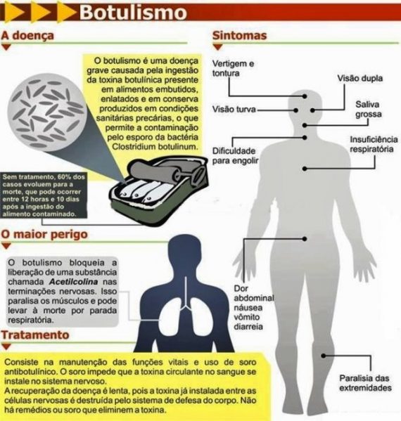 * Botulismo alimentar ocorre por ingestão de toxinas em alimentos contaminados e que foram produzidos ou conservados de maneira inadequada. Os alimentos mais comumente envolvidos são: conservas vegetais, principalmente as artesanais (palmito, picles, pequi); produtos cárneos cozidos, curados e defumados de forma artesanal (salsicha, presunto, carne frita conservada em gordura – “carne de lata”); pescados defumados, salgados e fermentados; queijos e pasta de queijos e, raramente, em alimentos enlatados industrializados.