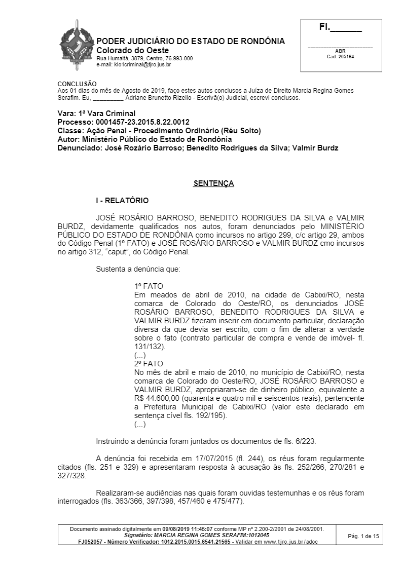 Na época da denúncia, o Ministério Público imputou ao ex-mandatário cabixiense, bem como a Benedito Rodrigues da Silva e a Valmir Burdz, a prática de crime de falsidade ideológica e peculato (apropriação de dinheiro ou bens públicos).