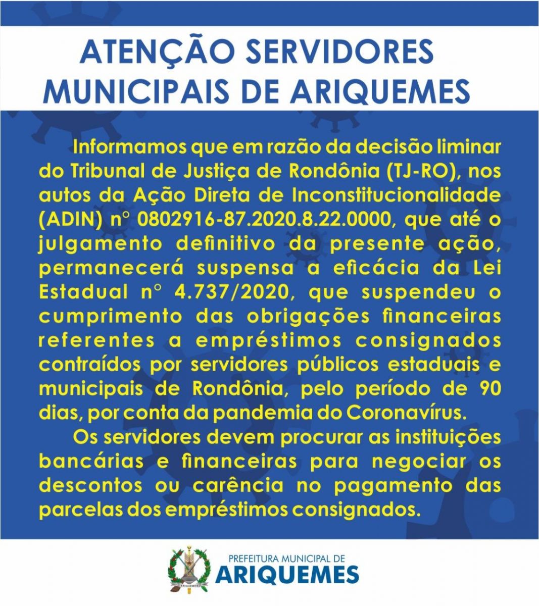 A Prefeitura de Ariquemes informa que em razão da decisão liminar do Juiz João Adalberto Castro Alves, do Tribunal de Justiça de Rondônia (TJ-RO), proferida na última segunda-feira (10), nos autos da Ação Direta de Inconstitucionalidade (ADIN) n° 0802916-87.2020.8.22.0000, que até o julgamento definitivo da presente ação, permanecerão suspensos os efeitos da Lei Estadual n° 4.737/2020, que suspendeu o cumprimento das obrigações financeiras referentes a empréstimos consignados contraídos por servidores públicos estaduais e municipais de Rondônia, durante o período de 90 dias, em decorrência da pandemia do Coronavírus (Covid-19).