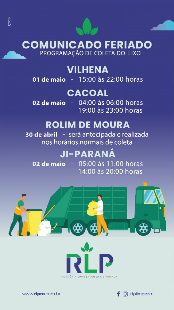Primando pela qualidade e responsabilidade de seus serviços, a RLP - Rondônia Limpeza Pública e Privada, comunica a toda a sociedade rondoniense, a agenda para a coleta de lixo nas cidades em que atua, veja abaixo: