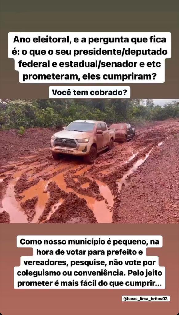 Uma publicação nas redes sociais expõe a revolta dos moradores da cidade com atual gestão. “Ano eleitoral e a pergunta que fica é: o que seu presidente/deputado federal e estadual, senadores e etc prometeram, eles cumpriram?”, questiona o perfil.