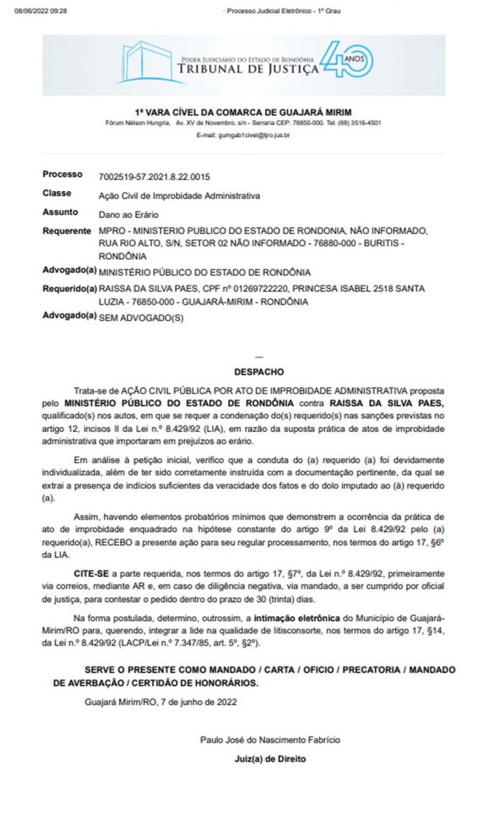 O juiz de Direito Paulo José do Nascimento Fabrício, da 1ª Vara Cível de Guajará-Mirim, recebeu ação civil pública de improbidade administrativa contra a prefeitra do município, Raíssa da Silva Paes, a Raíssa Bento, do MDB.