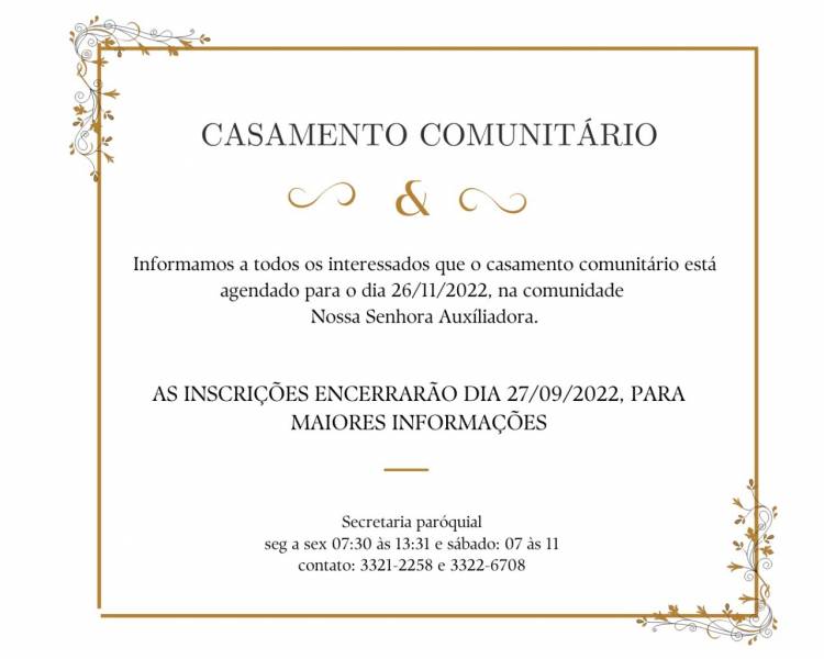 A Paróquia Nossa Senhora Auxiliadora, da Igreja Católica de Vilhena, divulga a abertura de inscrições para seu Casamento Comunitário 2022 que celebrará os sacramentos do matrimônio católico para os casais participantes. Tradicionalmente realizado em novembro, o evento cria condições facilitadas para noivos que tenham poucos recursos para cerimônias e ainda instrui os “pombinhos” em treinamento específico da igreja.